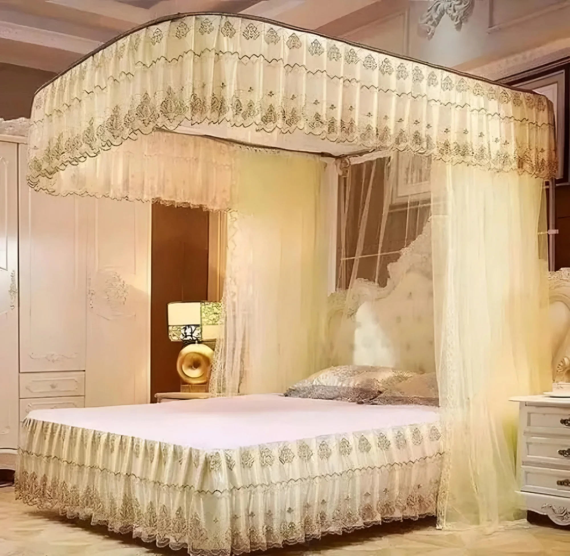 Designed with a modern rail-style structure, the 2 Stand Rail Mosquito Net Elegant Bed Canopy With Full Protection Sizes 4×6 5×6 6×6 White Cream Pink Purple. features two sturdy vertical stands connected by a horizontal support rail. This smart frame design allows the net to hang smoothly and evenly around the bed, creating an elegant canopy effect while ensuring complete protection from mosquitoes and other insects throughout the night.
