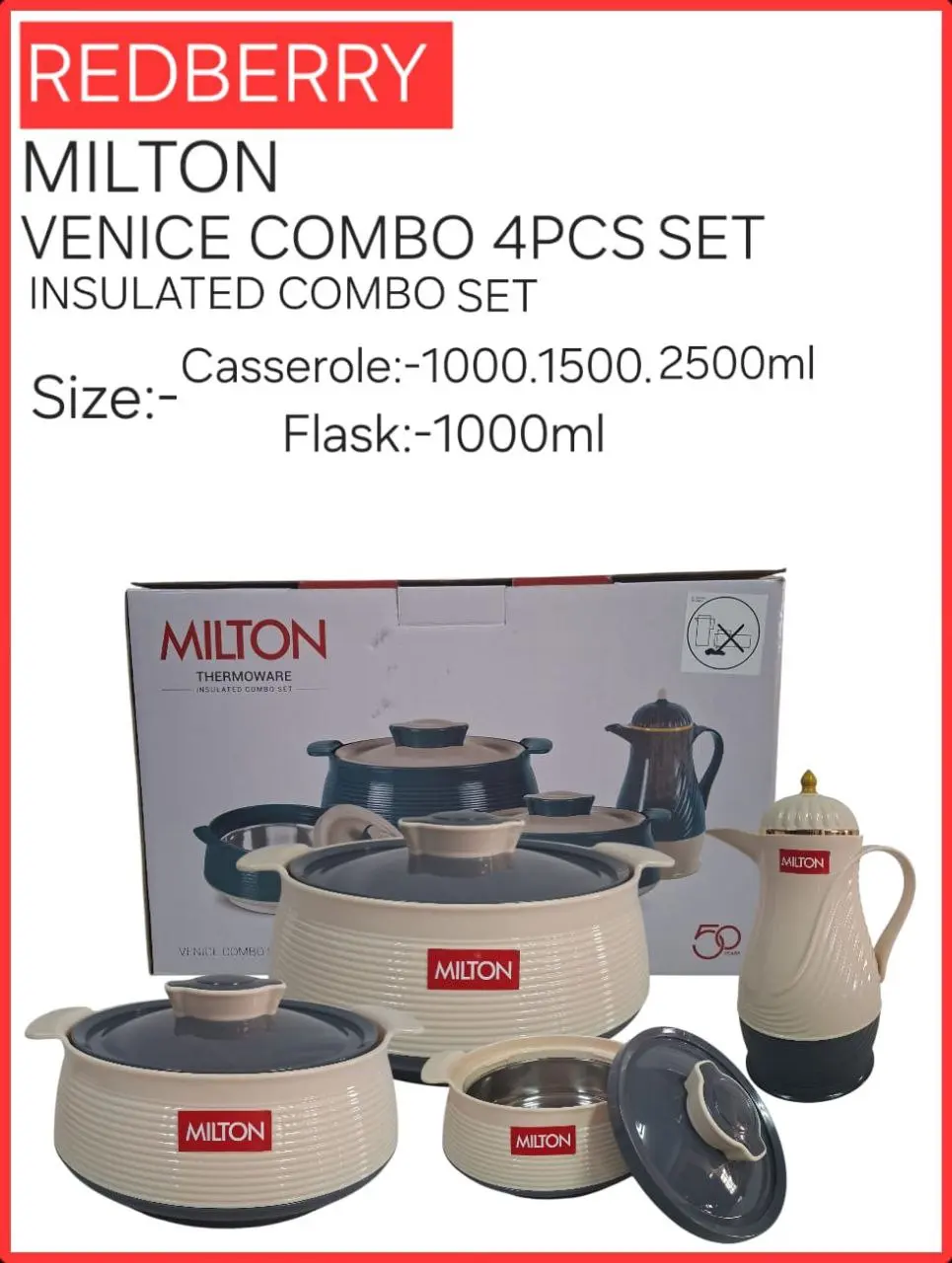 The 4pc Redberry Milton Venice Insulated Hotpot Set | Smart Enterprise is designed to support organized food serving and beverage storage in both home and shared dining environments. As part of the Redberry premium range, this combo set includes three insulated casseroles and one insulated flask, offering a practical solution for serving meals alongside hot or warm beverages.