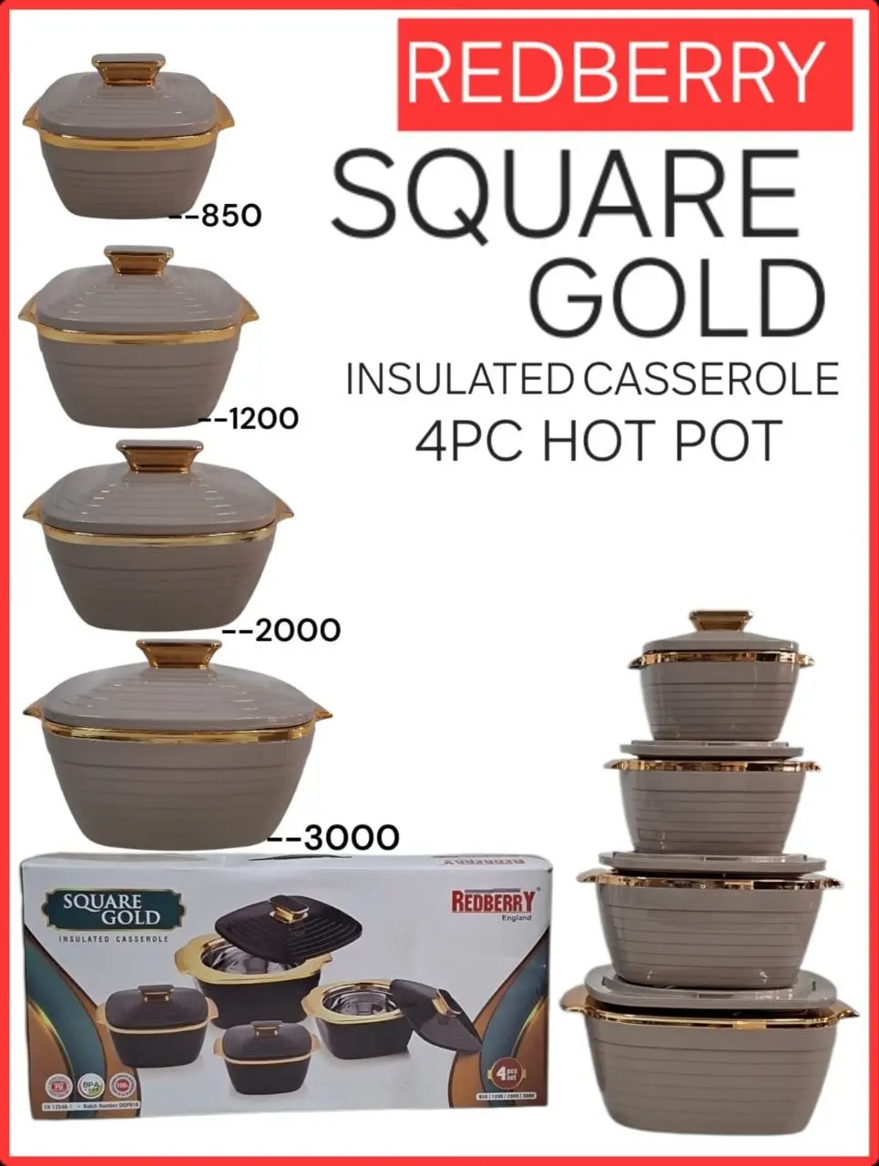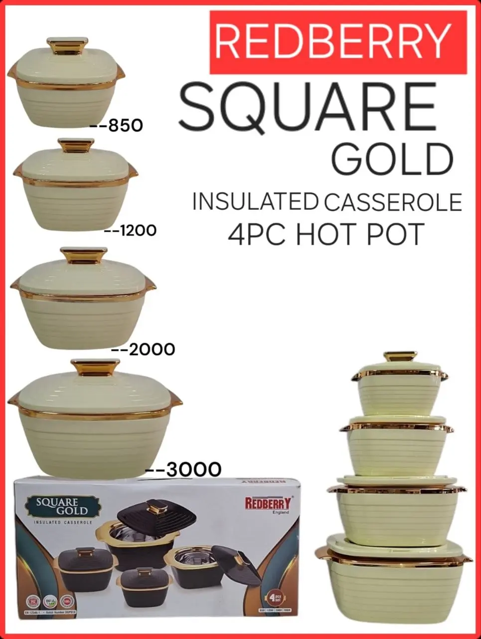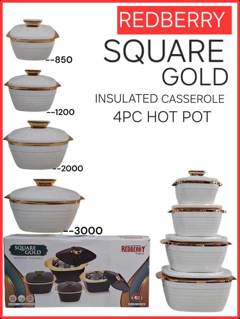 The 4pc Redberry Square Gold Insulated Hotpot Set | Smart Enterprise provides a practical combination of capacity variety, structured design, and coordinated appearance. It is well-suited for users looking to organize food serving efficiently while maintaining a clean and consistent presentation.