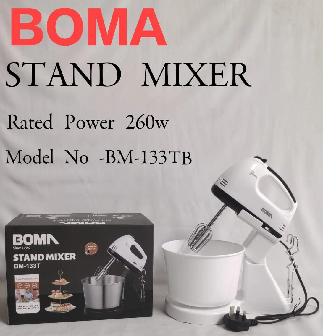The 260W BOMA BM-133TB Stand Mixer | Smart Enterprise is a compact, multi-speed kitchen mixer engineered to support everyday baking and food preparation tasks in Kenyan households. Designed with a rotating plastic bowl and detachable hand mixer functionality, this appliance delivers practical mixing performance while maintaining space efficiency and ease of use.