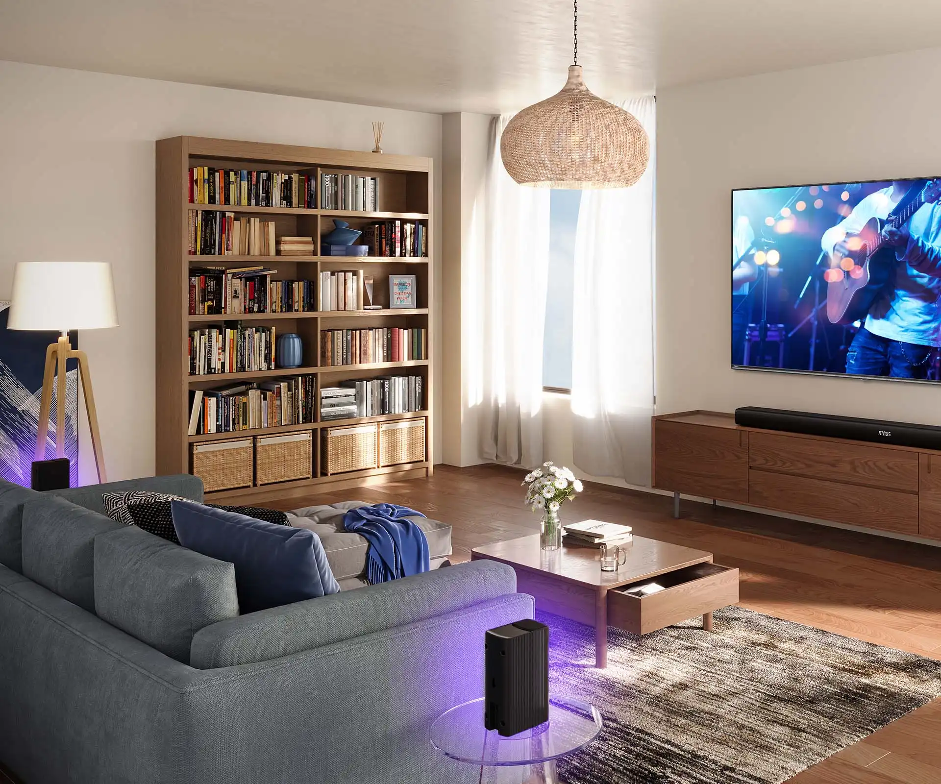 This balance of aesthetics and functionality ensures the system integrates cleanly into any living space without compromising acoustic performance.