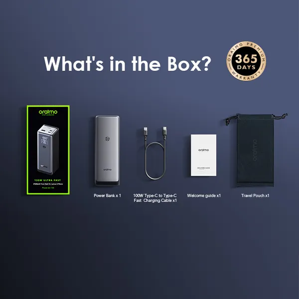 Downtime between uses is minimized through 100W USB-C Power Delivery input support. When paired with a compatible 100W PD wall charger (sold separately), the 27600mAh Oraimo PowerJet 130 Ultra Fast Power Bank | Smart Enterprise can recharge significantly faster than standard power banks with lower input ratings.