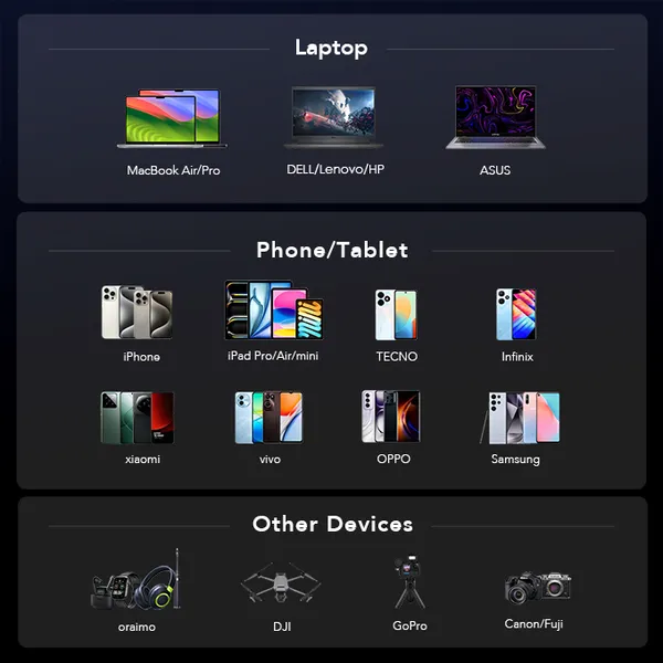 • Compatibility: Smartphones, tablets, USB-C laptops (device dependent)