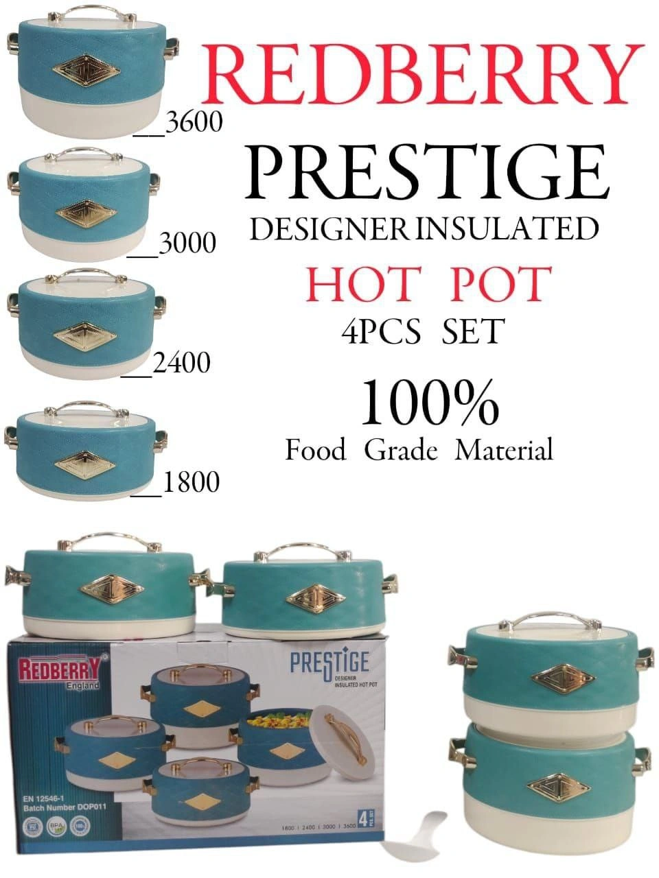 Product Name: REDBERRY PRESTIGE 4 Piece Designer Insulated Hotpot Set. Premium Food Warmers for Stylish Kenyan Homes