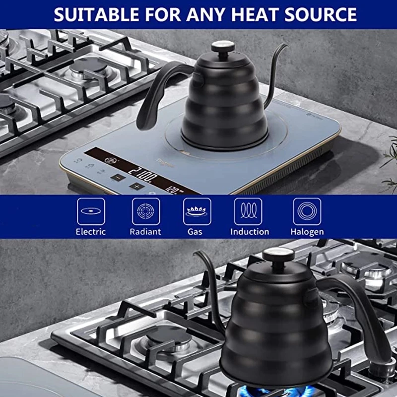 The versatility of the 1.2L Stainless Steel Gooseneck Coffee Kettle Precision Pour Over Kettle Black or Silver extends beyond coffee. It is equally effective for brewing loose-leaf tea, green tea, herbal infusions, and other manual brewing methods that require temperature control and gentle pouring. Compatible with gas, electric, and induction cooktops, it integrates seamlessly into any kitchen setup.